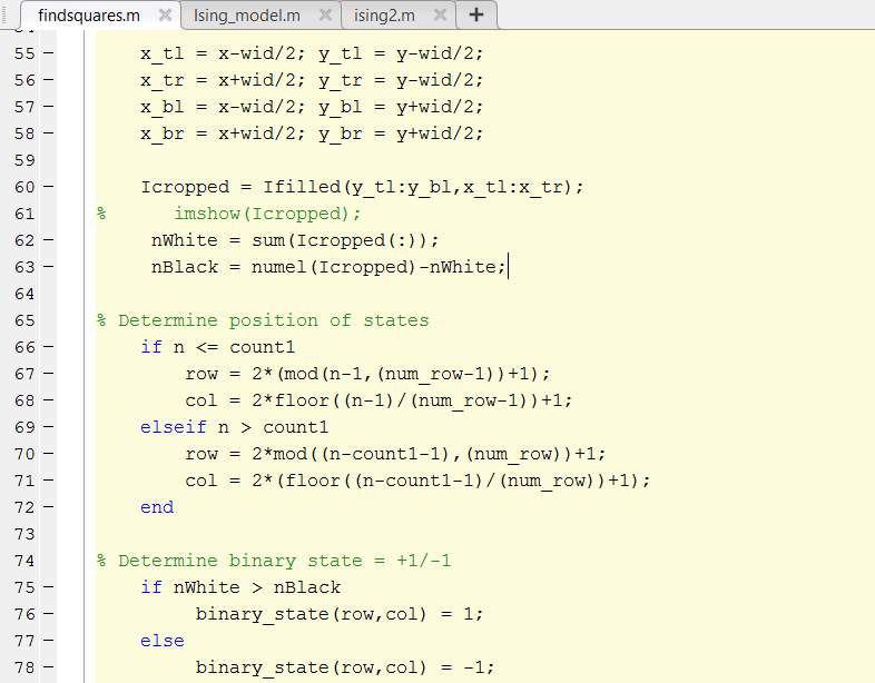 Then I wrote some more code that determined the number of black and white pixels in each designated square. If the majority of pixels were black, there was no connection between the two posts and the state would be assigned a -1 value, and if the majority was white, vice versa, Now, I used these row and column location values to assign these +1 and -1 values to their designated locations within a 19 x 37 binary array. And I thought I was done! But my graduate student pointed out that I should convert the binary array into a visual representation so that it would be easier for me to determine whether the code had worked successfully and the binary array was indeed a numerical representation of the given block copolymer pattern. So I worked on another code that worked on converting the array into an ideal visual representation.